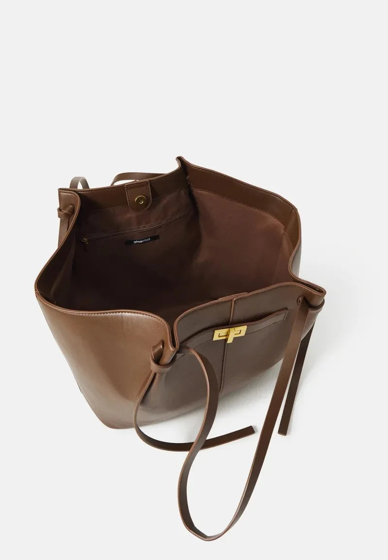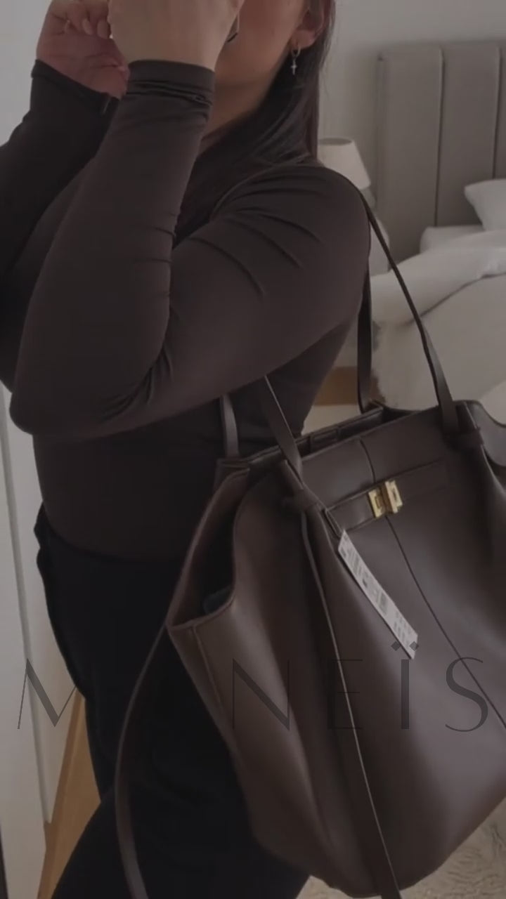 KATALEÏA offre un espace généreux pour accueillir ordinateur, documents A4, trousse, portefeuille et bien plus encore. Ses anses longues permettent un porté épaule confortable et chic, tandis que son cuir vegan lisse et ses détails dorés apportent une touche de luxe accessible à toutes vos tenues.